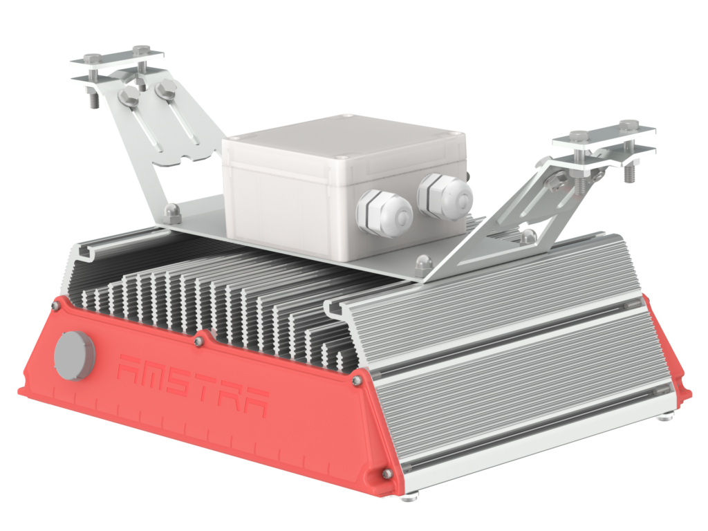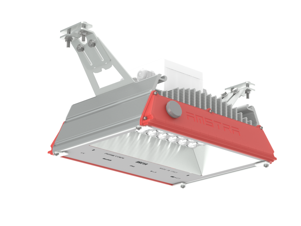 | Corpo lampada | Dissipatore monoblocco in alluminio estruso anodizzato 20µm resistente alle nebbie saline; testate colore rosso (RAL 3013) in poliammide con 30% di fibra di vetro autoestinguente V0; tappo di sfiato con membrana in PTFE e guarnizione siliconica |