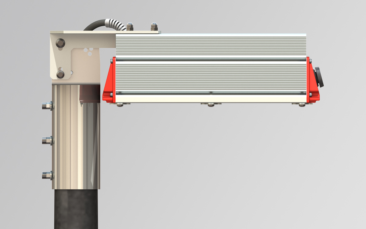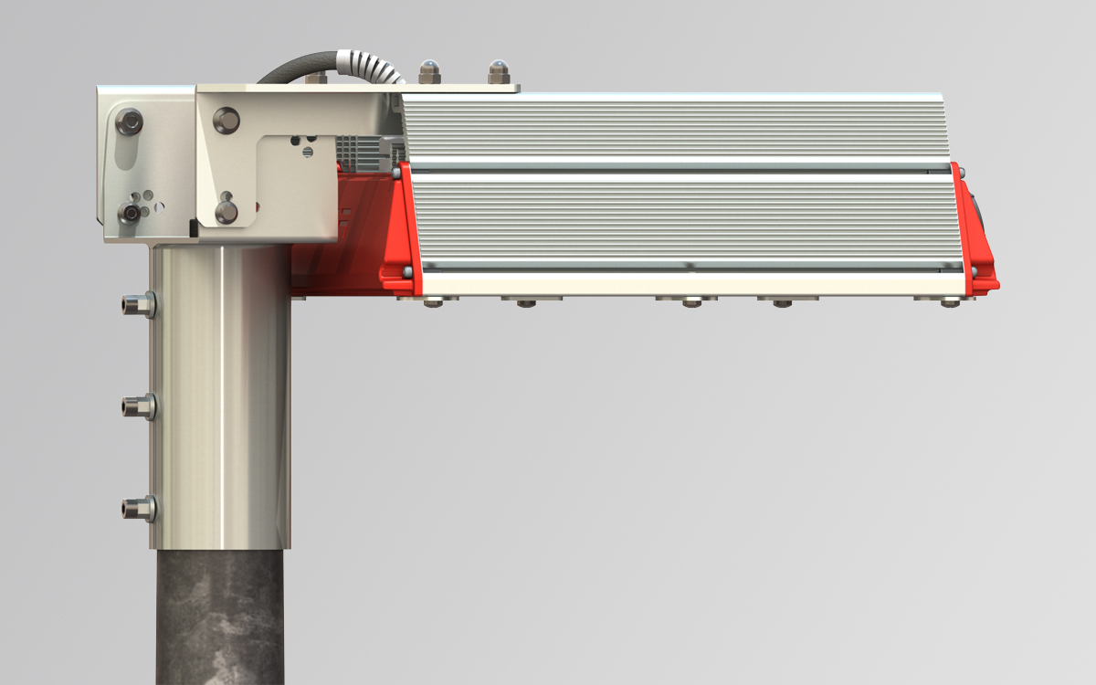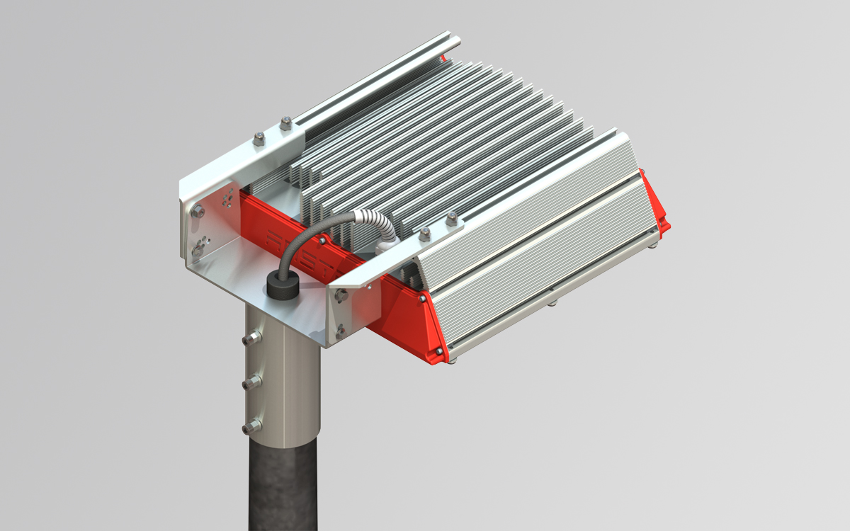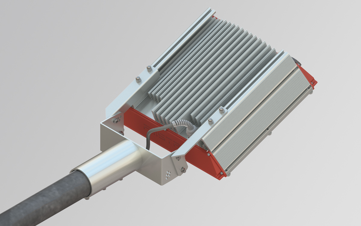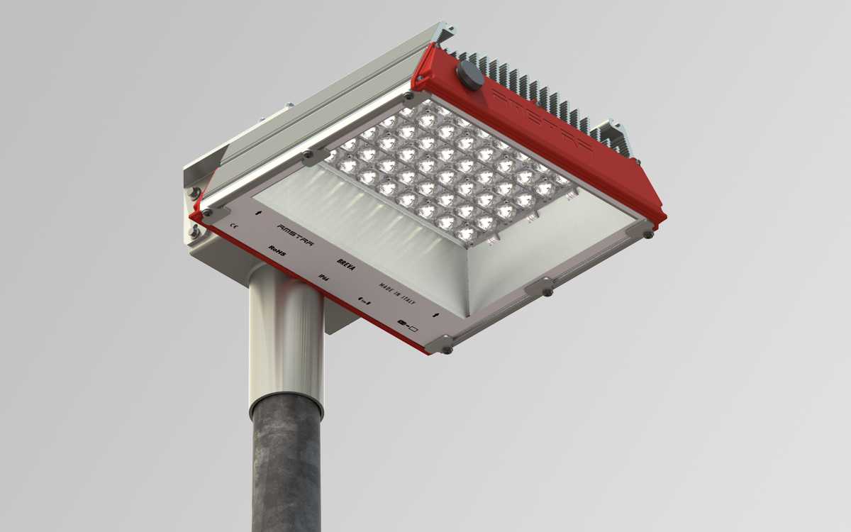 | Corpo lampada | Dissipatore monoblocco in alluminio estruso anodizzato 20µm resistente alle nebbie saline; testate colore rosso (RAL 3013) in poliammide con 30% di fibra di vetro autoestinguente V0; tappo di sfiato con membrana in PTFE e guarnizione siliconica |